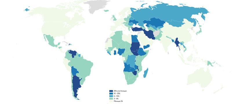 Высокие темпы роста цен – более 20% – в 2025 году сохранились лишь в отдельных странах, для которых проблемы инфляции традиционны: Турция, Аргентина, Венесуэла, Боливия, ряд африканских государств, в т. ч. Египет. Также традиционно сохраняются достаточно высокие (более 10%) темпы роста цен в африканских государствах, а также на пространстве СНГ.