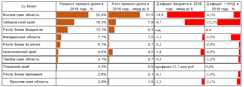 Рост долга из-за существенного дефицита бюджета был зафиксирован в республике Мордовии и Хабаровском крае. В Хабаровском крае дефицит бюджета по итогам 2018 года составил 13,1%. Итоги исполнения бюджета Мордовии за 2018 год еще не опубликованы, но по итогам 11 месяцев дефицит бюджета указанного региона составил 29,8%.