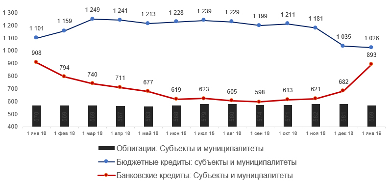 Прирост банковского долга в декабре 2018 обусловлен, в том числе, замещением бюджетных кредитов (рисунок 4), плановое погашение которых приходилось на конец года, а также для финансирование бюджетных инвестиций (на ноябрь – декабрь приходится, как правило, финансирование 40% годового объема бюджетных инвестиций).